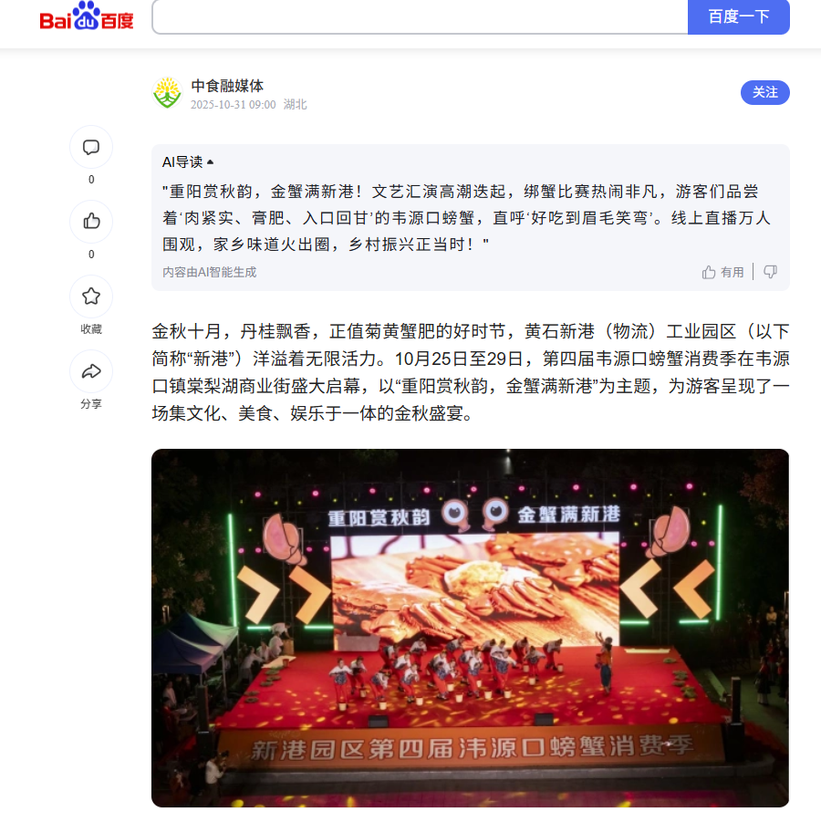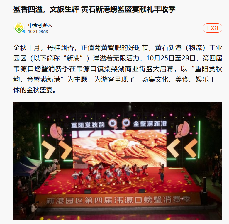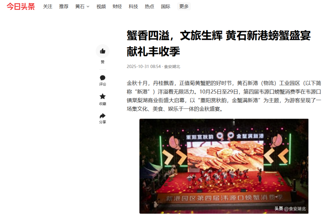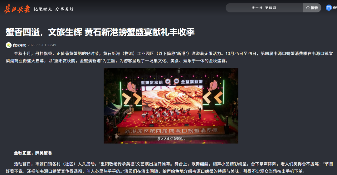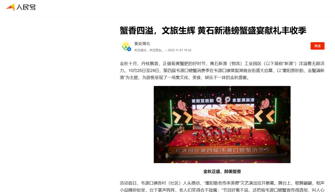 韦源口螃蟹消费季的热潮尚未褪去,品牌影响力已借势媒体矩阵持续发酵!《蟹香四溢 文旅生辉 黄石新港螃蟹盛宴献礼丰收季》一文登陆《人民日报》客户端后,迅速收获26147次阅读量,引发广泛关注。
