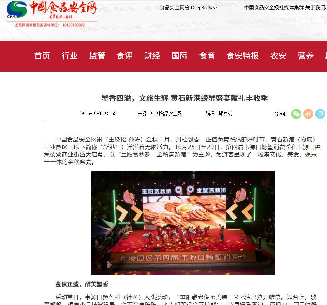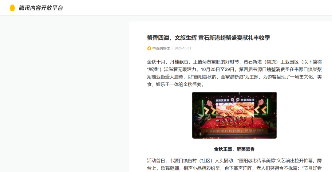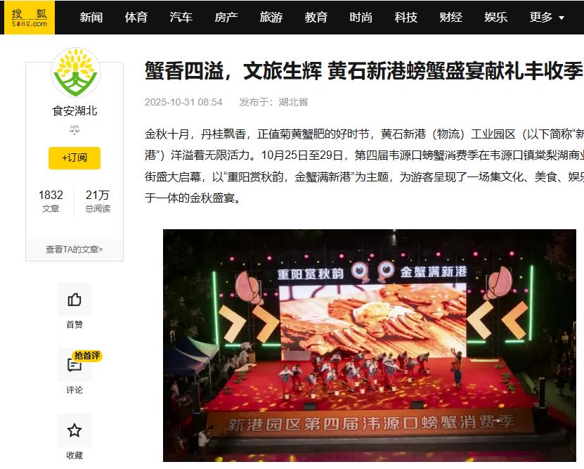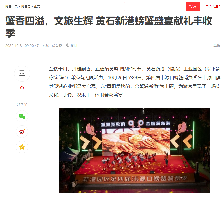 韦源口螃蟹消费季的热潮尚未褪去,品牌影响力已借势媒体矩阵持续发酵!《蟹香四溢 文旅生辉 黄石新港螃蟹盛宴献礼丰收季》一文登陆《人民日报》客户端后,迅速收获26147次阅读量,引发广泛关注。