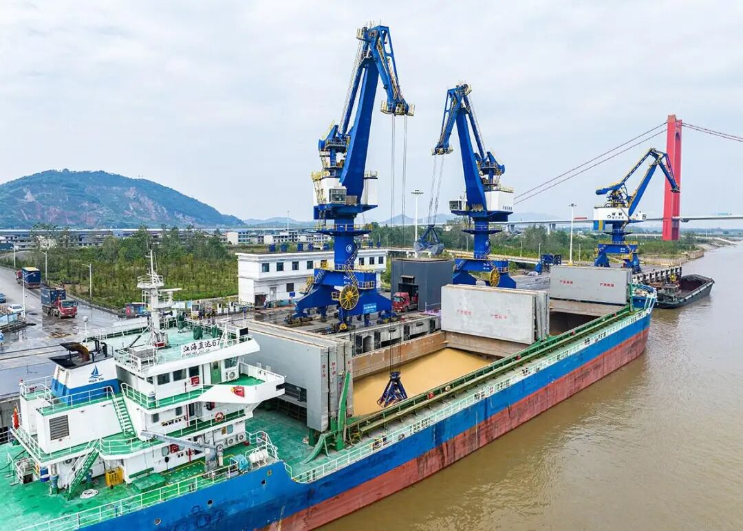 黄石新港码头,“江海直达”67号船正在进行卸船作业
