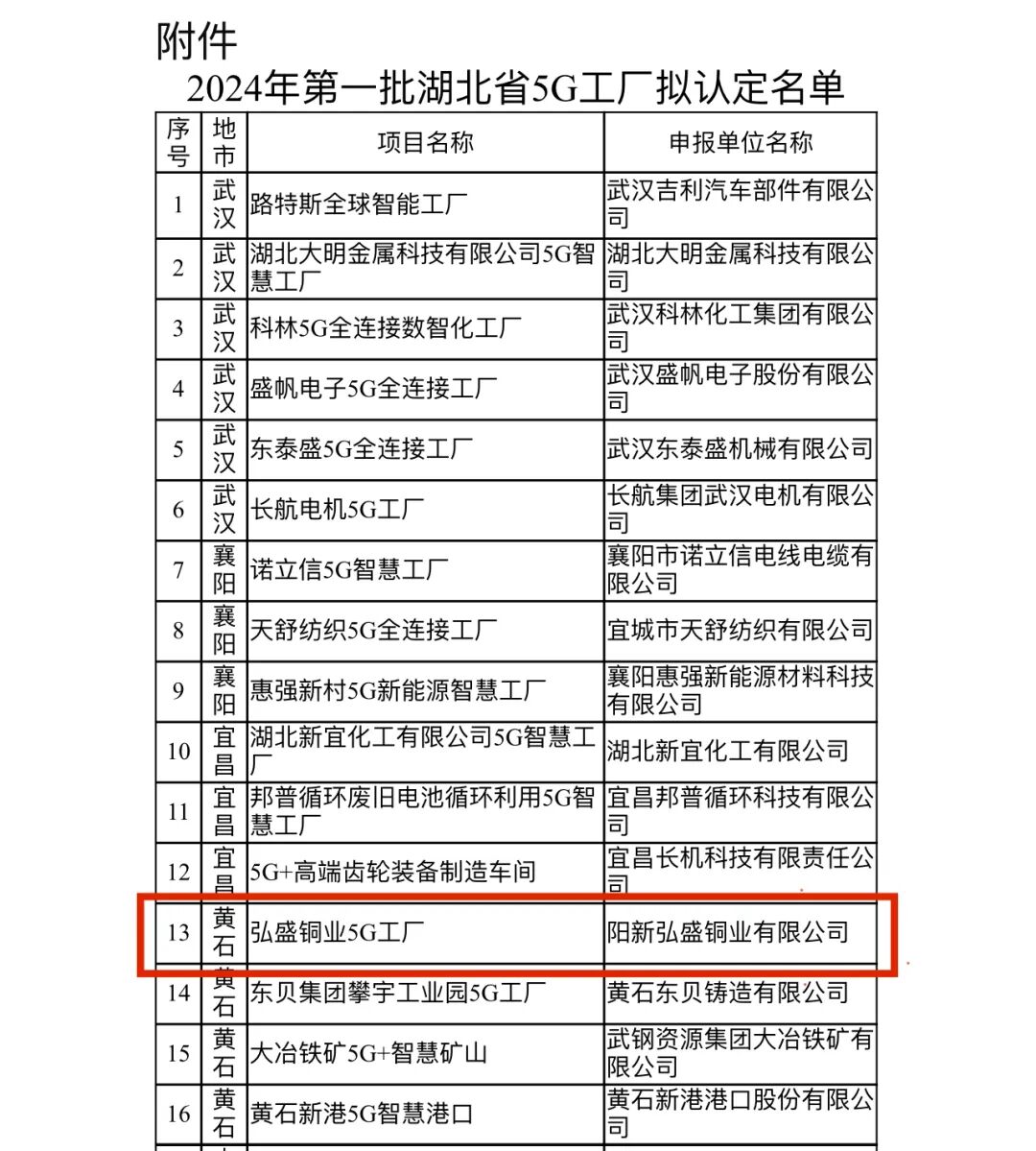 10月23日,弘盛铜业5G工厂成功入选2024年湖北省首批5G工厂,这是一代中色大冶人紧抓全球制造业分工调整和我国智能制造快速发展的战略机遇,大力推进冶炼行业“两化”融合发展,践行“中国制造2025”战略目标的生动实践。