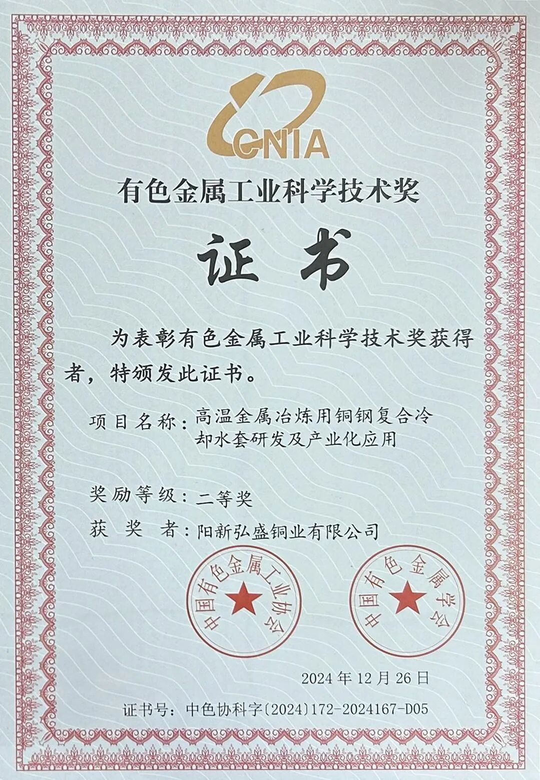 近日,弘盛铜业参与的科研项目“高温金属冶炼用铜钢复合冷却水套研发及产业化应用”获得2024年度有色金属工业科学技术奖二等奖。