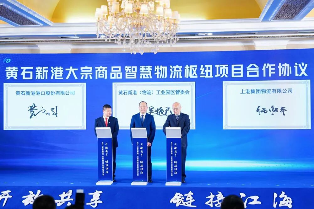 黄石新港园区、新港港口公司与上港集团物流有限公司签下合作开启大宗商品智慧物流枢纽项目协议。
