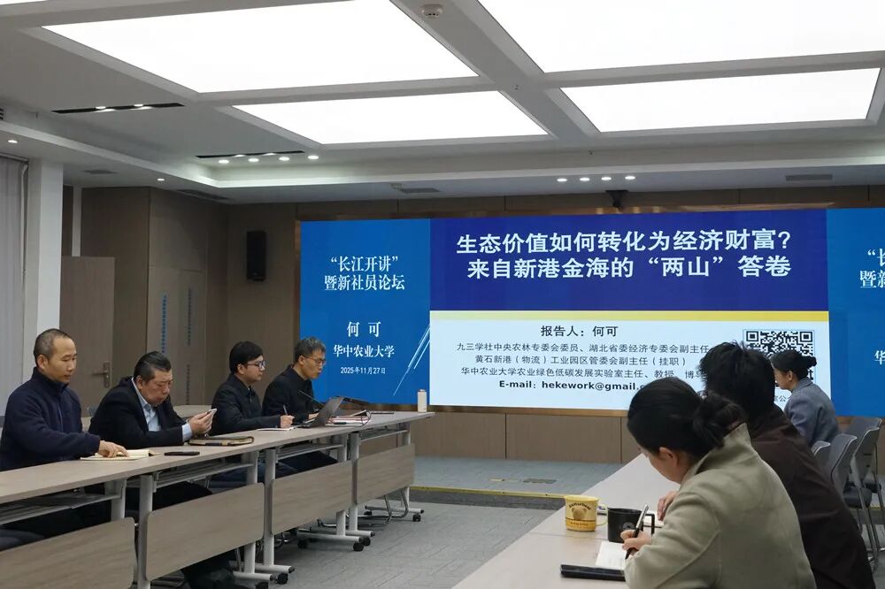 11 月 27 日,九三学社湖北省委“长江开讲”暨第五期同心起航计划新社员分享论坛在武汉举行。何可作了题为《生态价值如何转化为经济财富?来自新港金海的“两山”答卷》的专题讲座,聚焦“两山”理念基层实践,剖析政府、企业、村集体、农户四方协同机制,阐释生态价值如何嵌入经济循环并形成可持续闭环。
