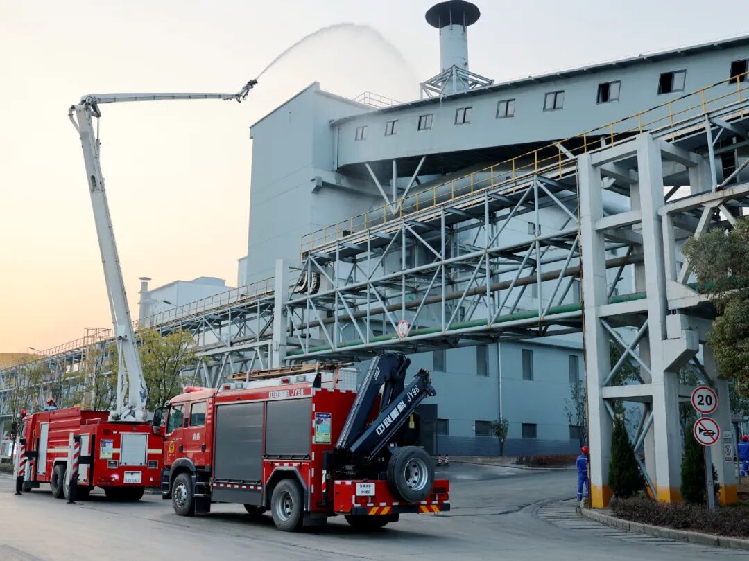 演练模拟配料区皮带起火,公司迅速启动预案,微型消防站、消防车及保卫人员率先展开初期火灾扑救与现场警戒,同步报警求助。消防救援大队接警后,立即调派力量赶赴现场,启动应急联动。双方依托消火栓及消防车远程水炮协同控火,各环节衔接紧密,高效完成灭火任务。
