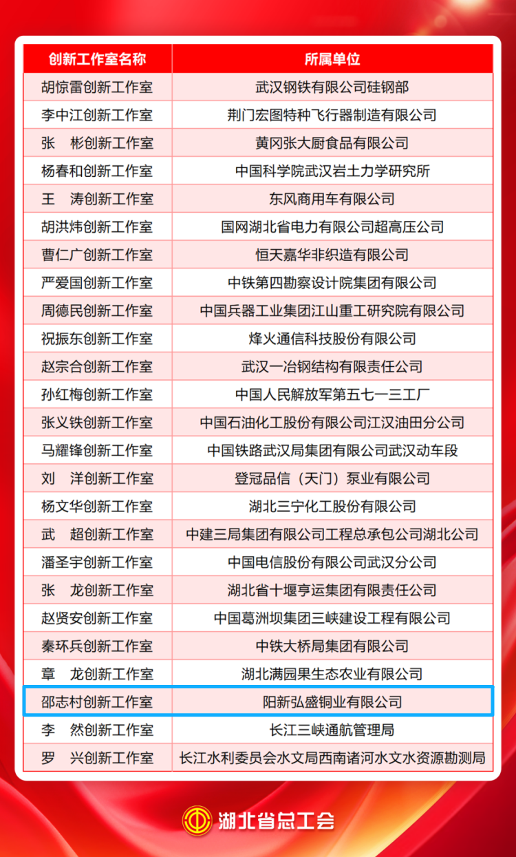日前,全国总工会公布了2025年全国总工会重点支持建设的全国劳模工匠创新工作室名单,弘盛铜业邵志村创新工作室成功入选,标志着公司创新工作室建设迈上新的台阶。