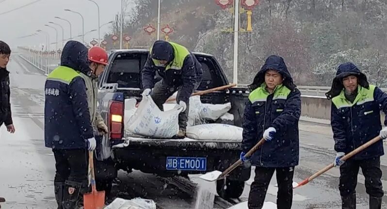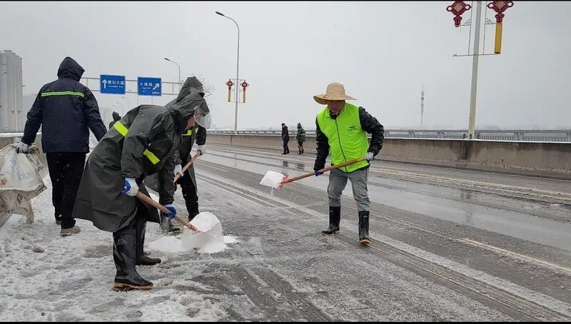 “我们组织了两个突击队,一组在韦源河大桥,一组在新港大桥开展撒盐铲雪作业。” 黄石新港环卫保洁服务有限公司总经理田认启介绍,低温天气下,桥面温度通常低于路面温度,更易出现结冰现象,保通保畅压力突出。为确保大桥运行安全,公司提前部署,全面进入抗冰保畅备战状态,提前调配10余台车、20余人分驻两座大桥,备足融雪盐、草袋、铲雪工具等物资,全天候守护桥面畅通与安全。