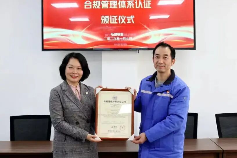 近日,弘盛铜业顺利通过中国检验认证集团审核,成功斩获“合规管理体系认证证书”。这是该企业继2023至2024年连续取得质量、环境、职业健康安全“三体系”及能源管理体系认证后,在标准化建设领域实现的又一重要突破。