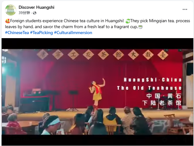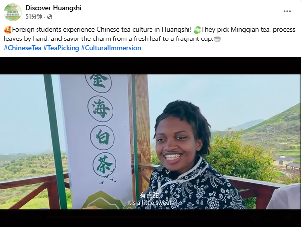 黄石新港园区金海管理区与黄石市融媒体中心联合邀请湖北理工学院国际学院留学生在金海女儿山上体验采茶,记录外籍留学生“成为中国人”。以金海白茶为媒,让外籍留学生在采茶、制茶、品茶中,融入中国人的生活,感受中国茶文化。黄石市融媒体中心现场记录了留学生们在女儿山体验采茶、制茶的过程和感受,并以《当采茶女的一天》为题制作了专题短片,该片于4月7日在海外社交知名平台Facebook的“Discover Huangshi”账号发布。国家地理标志产品金海女儿山白茶品牌由此走出国门,面向世界,跨出了品牌提升和产业发展的坚实步伐。