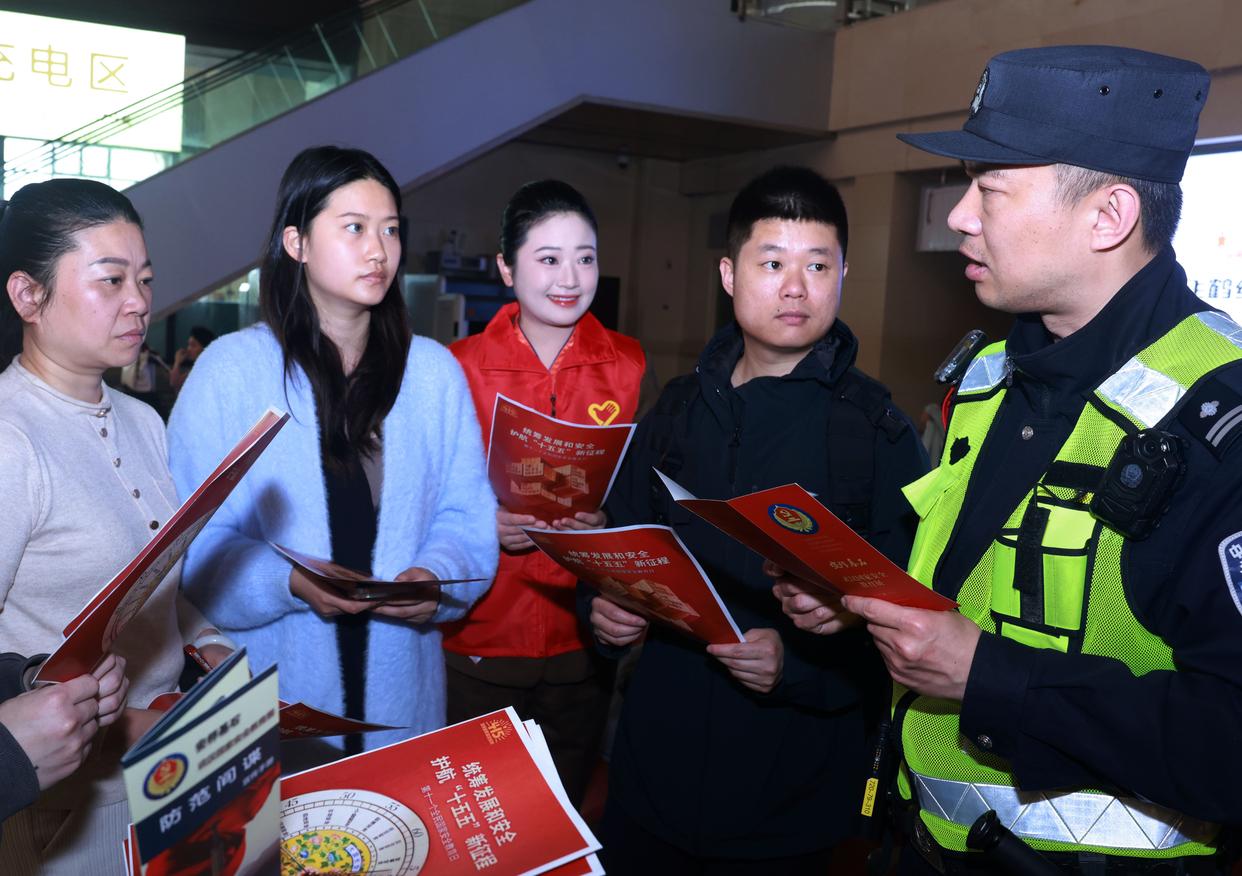 4月13日,武汉铁路公安处民警、志愿者在湖北省汉口站向旅客宣讲防范化解危害国家安全行为的知识。新华社发(赵军 摄)