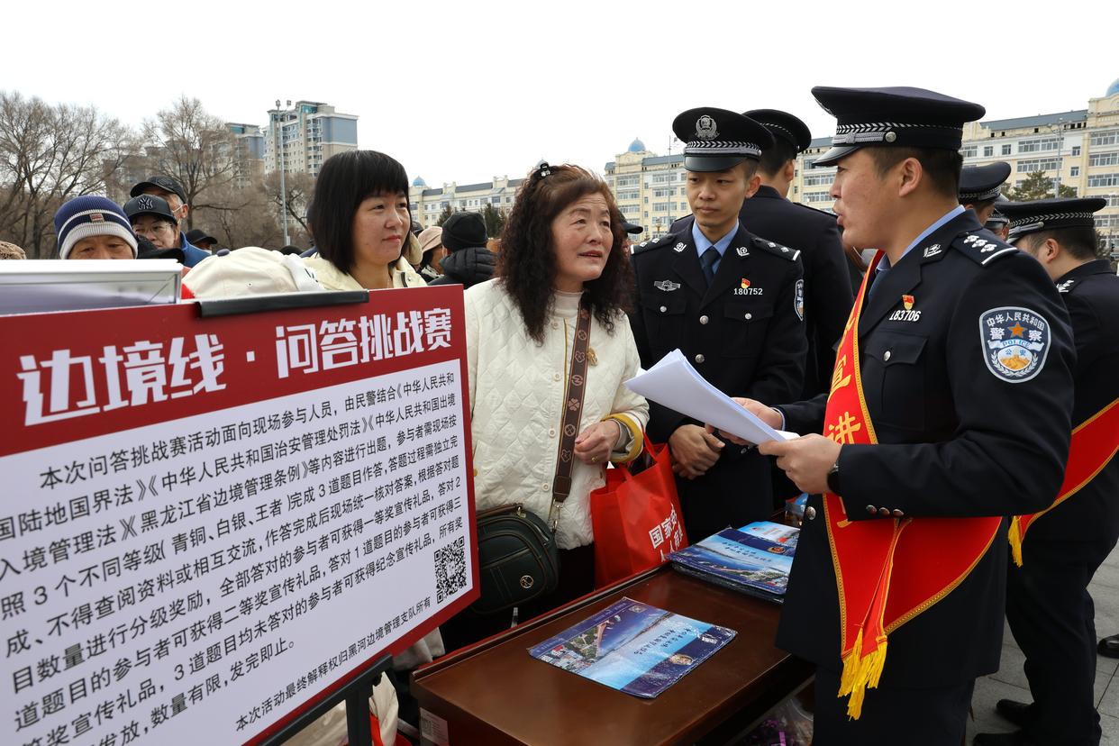 4月12日,在黑龙江省黑河市世纪广场,黑河边境管理支队民警向辖区居民宣讲国家安全相关知识。 新华社发(韩飞 摄)