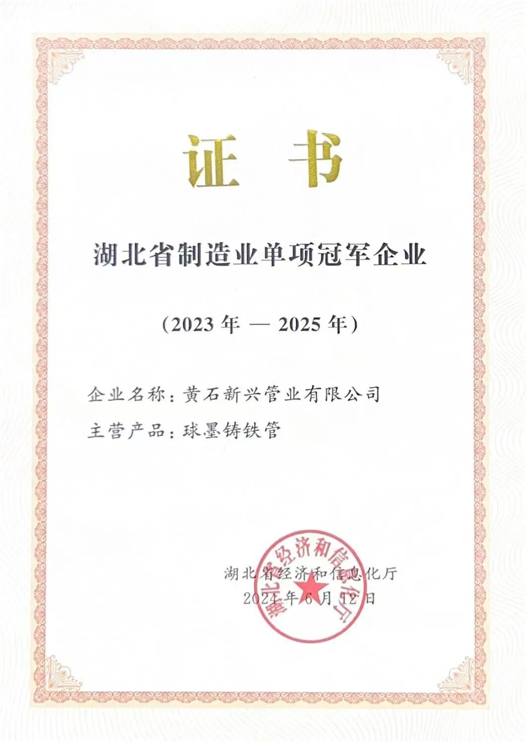 近日,黄石新兴管业有限公司凭借绿色、智能、高效的生产工艺及硬实力产品获评“湖北省制造业单项冠军企业”称号。