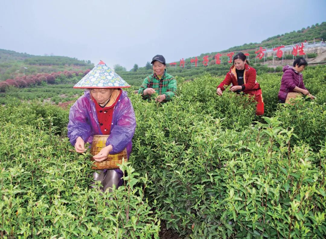村后茶山上,不时传来采茶人的欢声笑语。茶园里,浅绿的嫩芽争相抽生,随着采茶人灵巧的手指,一片片嫩芽公鸡争米般飞到竹篓里。正是应了“桃红柳绿茶如玉,薄雾似纱半遮面”的如诗意境。