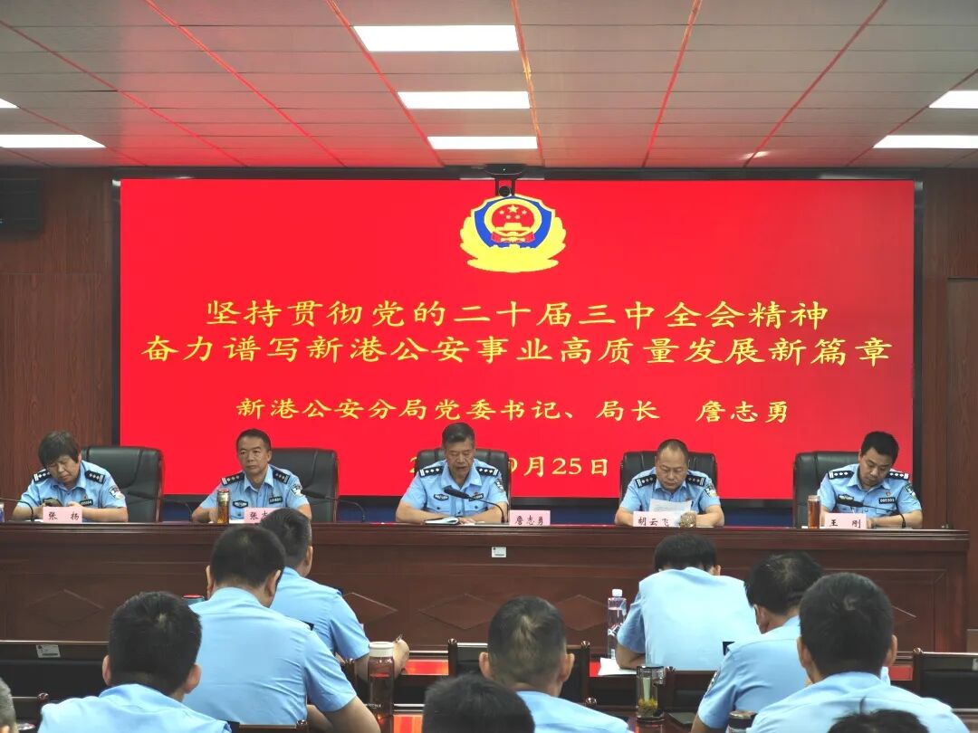 9月25日,新港公安分局召开学习贯彻党的二十届三中全会精神专题党课,新港园区党工委委员、公安分局党委书记、局长詹志勇主持并讲党课,全体党员民辅警参加会议。