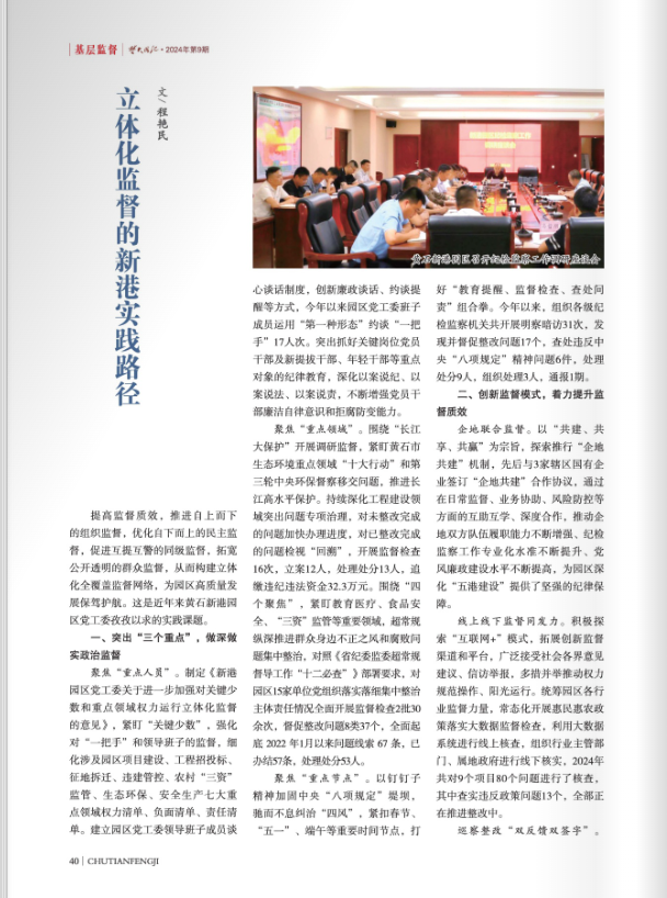 提高监督质效,推进自上而下的组织监督,优化自下而上的民主监督,促进互提互警的同级监督,拓宽公开透明的群众监督,从而构建立体化全覆盖监督网络,为园区高质量发展保驾护航。这是近年来黄石新港园区党工委孜孜以求的实践课题。