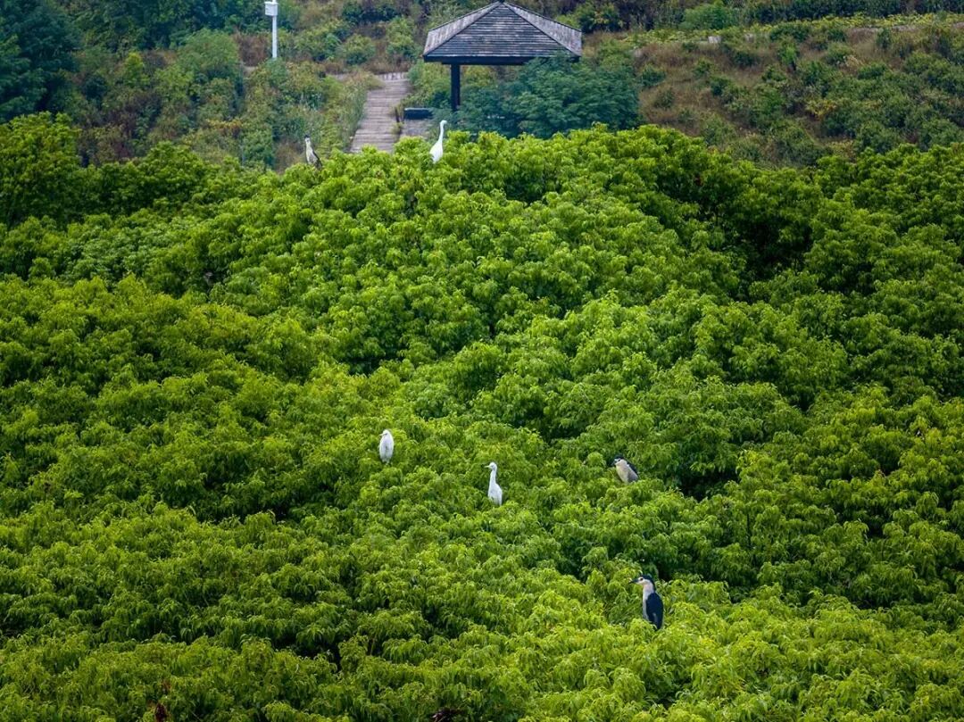 鹭鸟在海口湖畔树林上栖息